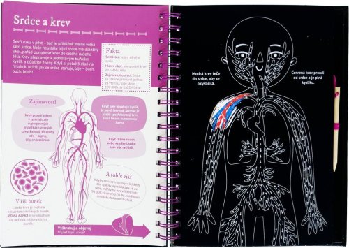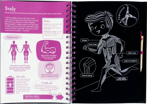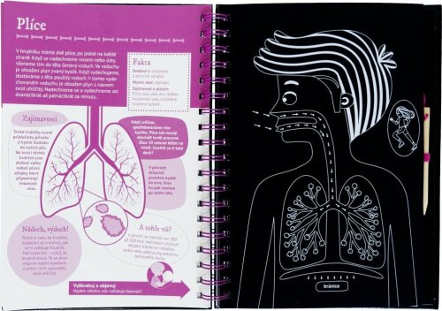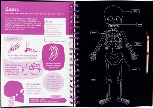 Vydej se na průzkum lidského těla a objevuj kostru, svaly i orgány. Tato nápaditá knížka je rozdělena do dvou částí. V první části je představena kostra a jednotlivé orgány, o kterých se dozvíš nejrůznější fakta a zajímavosti, doplněna stránkami s vyškrabávacími obrázky s popisky. Druhá část je poté plná kvízů, doplňování, bludišť, hledání a spojování. Ani zde nechybí nejrůznější fakta a zajímavosti o lidském těle a jeho fungování. Tak na nic už nečekej a vydej se za tímto vyškrabávacím dobrodružstvím. Počet stran: 40 Vazba: Kroužková Rok vydání: 2023 ISBN: 978-80-256-3421-9