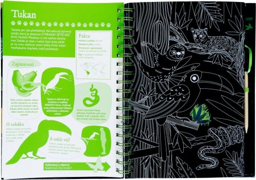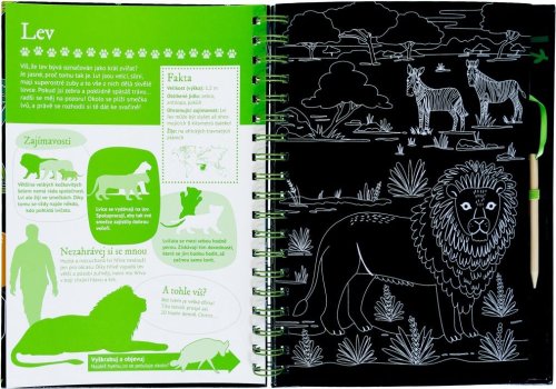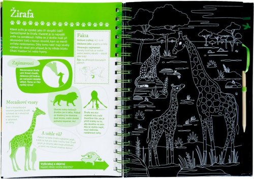Vydej se na průzkum zvířecí říše a seznam se s vysokými žirafami, hladovými lvy či chlupatými orangutany. Tato nápaditá knížka je rozdělena do dvou částí. V první části jsou představena zvířata, o kterých se dozvíš nejrůznější fakta a zajímavosti, doplněna stránkami s vyškrabávacími obrázky. Druhá část je poté plná kvízů, přiřazování, hledání, kreslení a doplňování. Ani zde nechybí nejrůznější fakta a zajímavosti o zvířatech a prostředí, ve kterém žijí. Tak na nic už nečekej a vydej se za tímto vyškrabávacím dobrodružstvím. Počet stran: 40 Vazba: Kroužková Rok vydání: 2023 ISBN: 978-80-256-3422-6