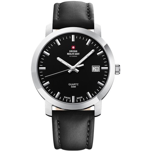 Pánské náramkové hodinky Napájení z baterie Průměr pouzdra 40,0 mm Pouzdro ve tvaru kruhu Ocelové pouzdro Stříbrná barva pouzdra Kožený tah ČERNÉ barva tahu Ručičkový ciferník Černá barva ciferníku Ciferník s dvanácti indexy Materiál skla - minerální sklo Odolné proti vodě během sprchování a mytí Datum