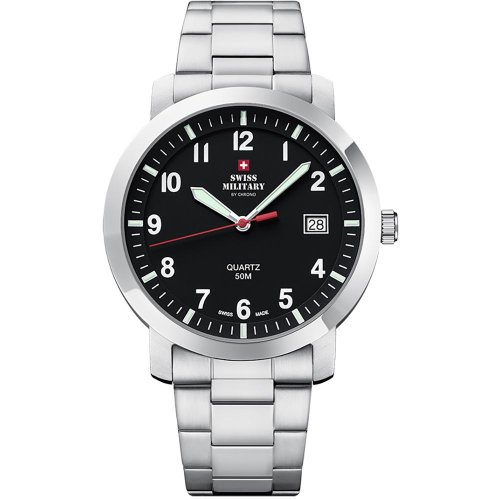 Pánské náramkové hodinky Napájení z baterie Průměr pouzdra 40,0 mm Pouzdro ve tvaru kruhu Ocelové pouzdro Stříbrná barva pouzdra Kovový tah Stříbrná barva tahu Ručičkový ciferník Černá barva ciferníku Ciferník s dvanácti indexy Materiál skla - minerální sklo Odolné proti vodě během sprchování a mytí Datum
