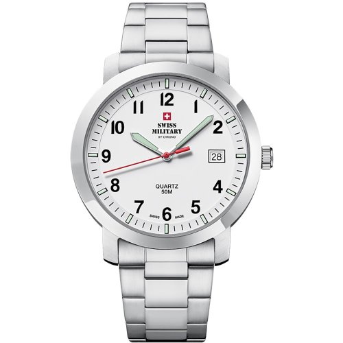 Pánské náramkové hodinky Napájení z baterie Průměr pouzdra 40,0 mm Pouzdro ve tvaru kruhu Ocelové pouzdro Stříbrná barva pouzdra Kovový tah Stříbrná barva tahu Ručičkový ciferník Bílá barva ciferníku Ciferník s dvanácti indexy Materiál skla - minerální sklo Odolné proti vodě během sprchování a mytí Datum