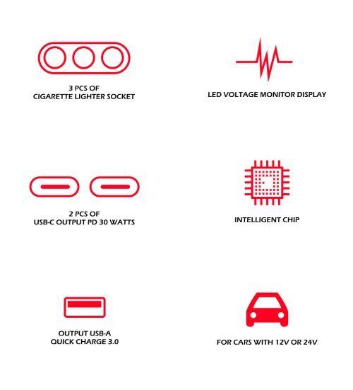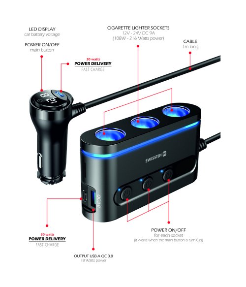 Kvalitně zpracovaná nabíječka do auta s výstupem USB, dvěma USB-C, podporou Power Delivery, Quick Charge 3.0 a výkonem 30 W. K dispozici jsou také tři CL výstupy s výkonem 108–216 W, které slouží k připojení autolednice či autokamery. Jednotlivé CL výstupy jsou vybaveny tlačítky pro vypnutí/zapnutí.