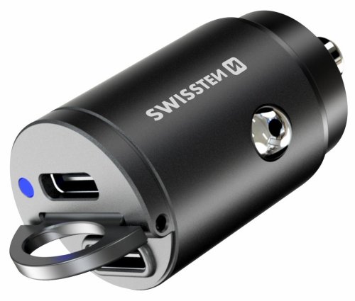 SWISSTEN 20111900; Miniaturní nabíječka do auta se dvěma výstupy USB-C s výkonem až 45 W, která na cestách spolehlivě nabije jakýkoli mobilní telefon nebo tablet, a to i současně.