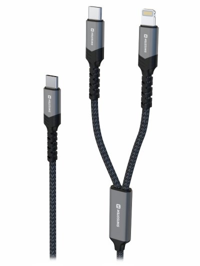 Praktický kabel s délkou 1,5 metru umožňuje nabíjet dvě zařízení najednou díky kombinaci konektorů USB-C a Lightning. S podporou výkonu až 100 W poskytuje dostatek energie pro nabíjení notebooků, tabletů i mobilních telefonů. Při současném připojení obou konektorů se výkon inteligentně rozdělí mezi USB-C (až 54 W) a Lightning (až 19,8 W).