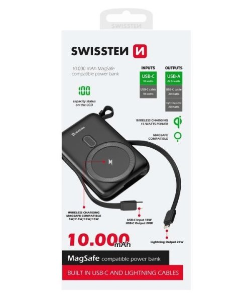 SWISSTEN powerbanka podporuje technologii MagSafe, díky čemuž umožňuje bezdrátové nabíjení zřízení Apple. Součástí jsou také integrované kabely s konektory USB-C a Lightning pro univerzální napájení rozmanitých přístrojů. S powerbankou SWISSTEN máte na túrách, kempování v přírodě nebo na venkovních festivalech vždy dostatek energie.