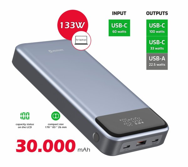 Powerbanka v elegantním provedení s kapacitou 30 000 mAh nabízí dva USB-C a jeden USB port pro nabíjení až tří zařízení současně. Maximální výstupní výkon až 133 W umožňuje nabíjení všech vašich zařízení, včetně notebooků. Zároveň podporuje vstupní výkon až 60 W, což výrazně zkrátí dobu potřebnou k jejímu nabití. Porty podporují oba nejvyužívanější formáty rychlonabíjení Power Delivery i Qualcomm Quick Charge. Potěší také praktický LCD displej zobrazující aktuální stav nabití.