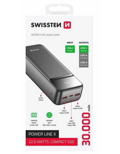 Powerbanka SWISSTEN POWER LINE II 30 000 mAh je spolehlivý zdroj energie pro vaše zařízení na cestách. Kompaktní a lehké provedení umožní snadné přenášení v tašce, batohu nebo v ruce. V rámci domova můžete nabíjet své zařízení třeba z postele, abyste pak nemuseli vstávat. Hlavní uplatnění však najde u milovníků cestování, dobrodružství a přírody. Vždy, když vyrazíte do kempu, na výlet do lesa nebo na víkendový festival, plně nabitá baterie se vždy hodí. Powerbanka SWISSTEN POWER LINE II disponuje kapacitou 30 000 mAh, která je dostatečná pro nabití smartphonu, tabletu nebo drobné nositelné elektroniky – fitness náramku, sluchátek, chytrých hodinek apod.