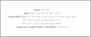 USB-C1 / C2: 5V DC 3A, 9V DC 2.22A, 12V DC 1.67A / 20W max.