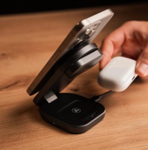 Elegantní 3 v 1 bezdrátová nabíječka s nejnovější Qi2 technologií pro současné nabíjení iPhone, Apple Watch a AirPods.