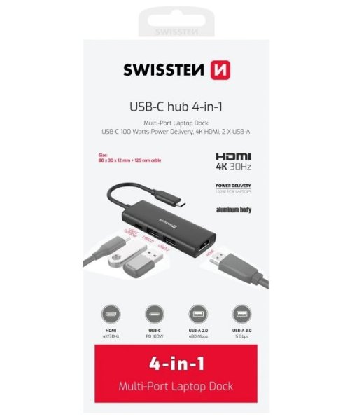Odolná a kompaktní dokovací stanice SWISSTEN USB-C HUB 4v1, se kterou rozšíříte konektivitu svého notebooku nebo tabletu. Poskytne vám dostatek portů pro připojení periferních zařízení, které potřebujete pro flexibilní pracovní činnost i multimediální zábavu. Dokovací stanice SWISSTEN USB-C HUB 4v1 44040201 se připojuje pomocí portu USB-C, disponuje rozhraním HDMI, které podporuje rozlišení 4K při 30 Hz, USB 3.0 portem s vysokou přenosovou rychlostí pro připojení flash disku, USB-C pro napájení s technologií Power Delivery a USB 2.0. Díky kompaktnímu hliníkovému designu se snadno přenáší, a tak základní porty můžete využívat kdekoli na cestách.