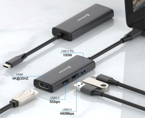 Kompaktní a praktická dokovací stanice, která snadno rozšíří konektivitu zařízení, jako jsou notebooky či tablety. Připojuje se pomocí USB-C portu, skrze který může také přenášet napájení o výkonu až 100 W. Nabízí HDMI port s podporou rozlišení 4K při 30 Hz, jeden USB 3.0 port s přenosovou rychlostí až 5 Gb/s a jeden USB 2.0 port s rychlostí 480 Mb/s. Je vyrobena z odolného hliníku, což zajišťuje pevnost a odolnost vůči opotřebení.