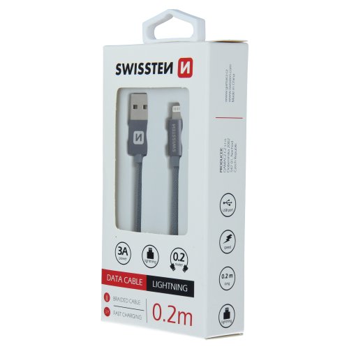 Datový kabel Swissten USB/Lightning s kvalitním textilním opletením a kovovými kryty konektorů. Díky délce 0,2m je vhodný především k nabíjení z power bank či notebooků. Kabel je zesílený a přenese tak větší proud (až 3A) a zvládne i rychlý přenos dat 480 Mb/s. Životnost kabelu v ohybu je více než 10000 ohybů. Kovový kryt konektoru je odolnější proti mechanickému poškození než běžné plastové kryty konektorů.