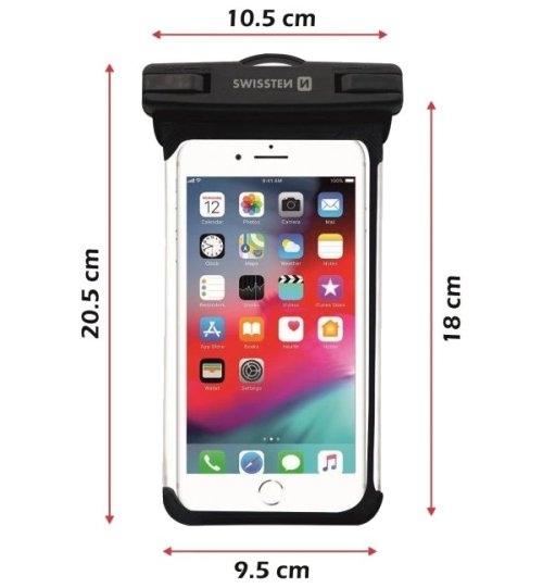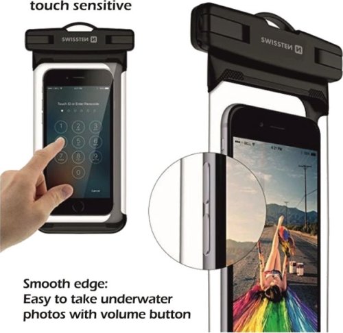 SWISSTEN vodotěsné pouzdro pro mobilní telefony s úhlopříčkou displeje až 6,5 palců. Postará se o dokonalou bezpečnost vašeho smartphonu, ať už se plavíte po řece, bavíte u bazénu, relaxujete při chytání ryb, výletě na parníku apod. Vodotěsné pouzdro SWISSTEN splňuje stupeň krytí IPX8, a tak je nemyslitelné, aby pronikla jakákoli vlhkost. Průhledná povrchová vrstva umožňuje ovládání telefonu pomocí dotyku, takže i během psaní SMS, telefonování a dalším používání zůstane chráněn a v bezpečí.
