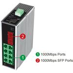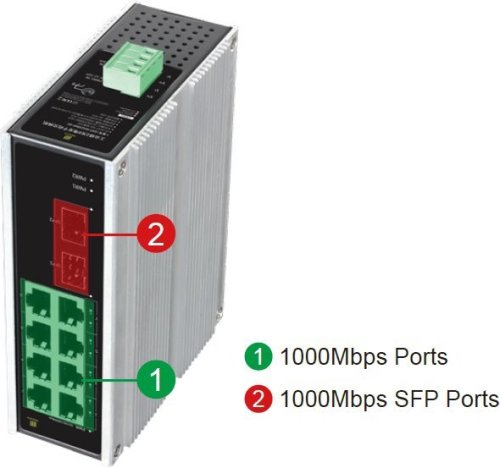 Switch namontujete na DIN lištu. Jelikož není vybavený ventilátorem, má tichý chod. LAN porty vám navíc zajistí přenosovou rychlost 10/100/1 000 Mbps. Napájení probíhá přes DC svorkovnici.