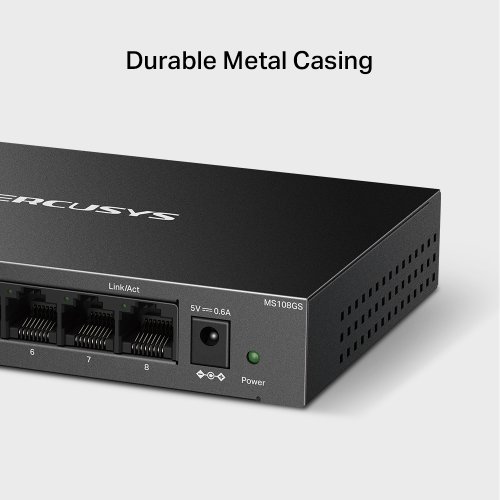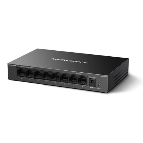 TP-Link Mercusys MS108GS je spolehlivý 8portový gigabitový switch v kovovém provedení, který okamžitě rozšíří vaši kabelovou síť bez složité konfigurace. Díky 8× 10/100/1000 Mb/s portům zajistí rychlé a stabilní připojení pro domácnost i malou kancelář.