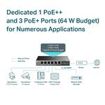 Switch TP-Link TL-SG1006PP je vybavený celkem šesti 10/100/1000Mbps RJ45 porty. Z toho má 1 PoE++ port a 3 PoE+ porty. Switch spolupracuje se standardem IEEE 802.3af/at/bt (kompatibilní s PD). Pomocí kabelu současně přenášíte data a napájíte zařízení. Port 1 (standard 802.3af/at/bt PoE++) poskytuje výkon až 60 W. Porty 2–4 (standard 802.3af/at PoE+) mají výkon až 30 W na každém PoE+ portu. Celkový výkon na napájení PoE dosahuje hodnoty 64 W. K přepínači připojíte IP kamery, přístupové body, IP telefony, počítače, tiskárny a další podobná kompatibilní zařízení.