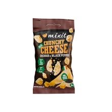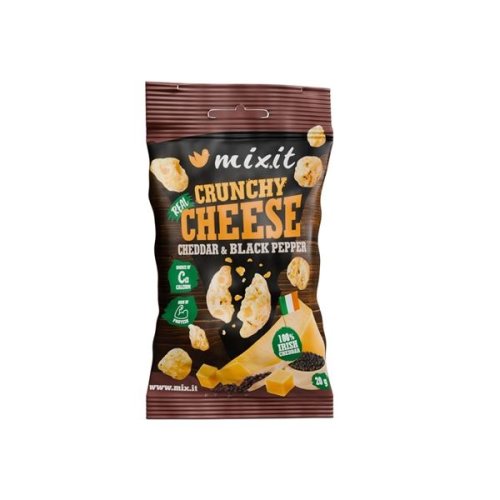 Sýrové krekry Mixit - kvalitní irský cheddar s jeho specifickou plnou chutí a usušený speciálním procesem a přidali drcený černý pepř - tak akorát, aby to bylo jemně pikantní, ale stále vynikla chuť sýru, výsledkem je extra křupavý snack do kapsy plný bílkovin a vápníku