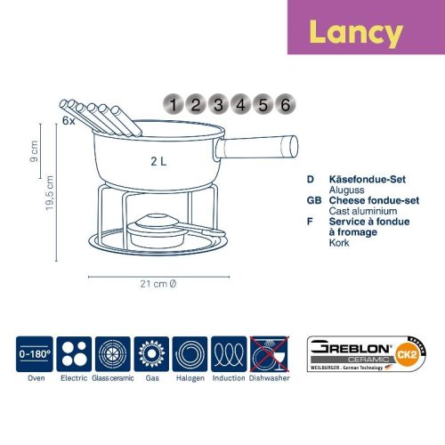 - kompletní sada na sýrové fondue LANCY- vnitřní keramický povrch je nepřilnavý, vysoce odolný proti odření a praskání a jelikož se potraviny nepřipalují, je také velmi nenáročný na údržbu- stojánek …