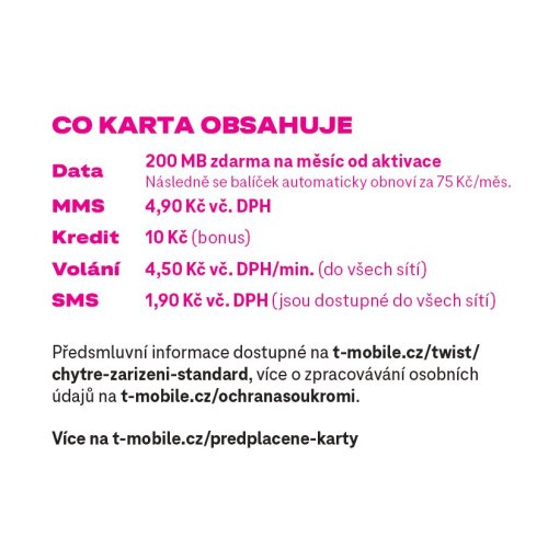 Předplacená karta od T-Mobilu vhodná pro chytrá zařízení s malým objemem datových přenosů typu dětské hodinky, hlídací zařízení, pohybová čidla nebo chytré hodinky Zkontrolujte si v aplikaci nastavení, případně si vyberte výhodnější balíček Například s měsíčním datovým limitem 80 MB, 5 GB, 20 GB anebo roční balíček s měsíčním datovým limitem 2 GB Služby lze využívat V RÁMCI CELÉ EU