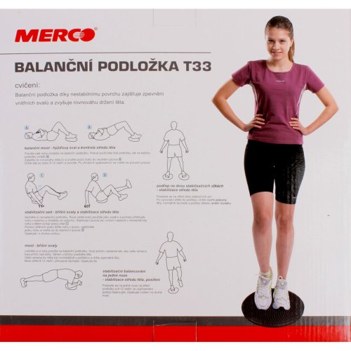 Balanční podložka Merco T33 je vhodná především pro lidi, kteří mají sedavé zaměstnání a chtějí předejít bolestem zad. Díky sezení na balanční podložce budete procvičovat stabilizační svaly a vzpřimovač páteře po celou dobu sezení aniž byste o tom věděli. Dále tato podložka vede ke správnému držení těla a je vhodná pro všechny v každém věku. Jak si polštářek nafouknete, nebo kterou stranou ho otočíte je už jen a jen na Vás. Z jedné strany je balanční polštář hladký, z té druhé má masážní bodlinky. Čím více vzduchu, tím je náročnost udržovat rovnováhu nižší. Samotná podložka váží 1 kg a je určena pro maximální zatížení 120 kg. K nafouknutí podložky je zapotřebí pumpička s jehlou (nejsou součástí balení).
