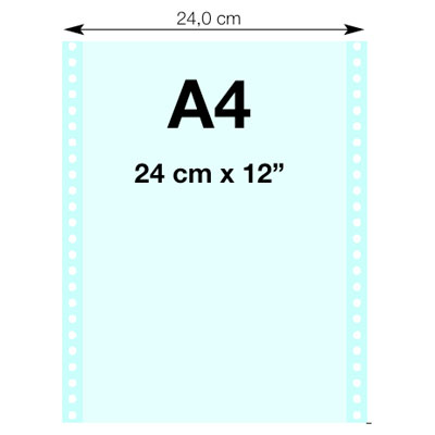Tabelační papír s oddělitelnou boční perforací 60 g/m² Šíře papíru 24 cm (měřena od kraje ke kraji), výška 12 palců (tj. 30,5 cm) 1 originál + 2 kopie Balení obsahuje 750 složek