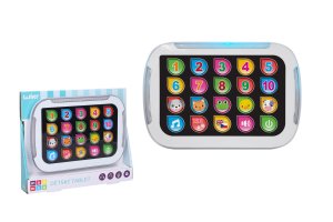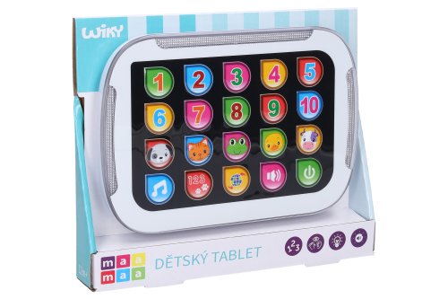Tablet dětský - mluví česky. Rozměry 19x13 cm. Světelné a zvukové efekty. 3xAAA baterie součástí. Aktivace tlačítkem v pravém dolním rohu. Výuka čísel, zvířat, melodie, změna jazyka, nastavení hlasitosti.