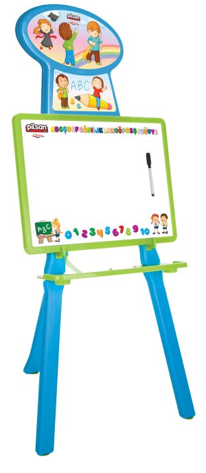 Stírací stojací tabule s bílou deskou, 2 nastavitelné výšky tabule (od země vrchní hrana 76 cm a vyšší pozice 87 cm), kreslící tabulka o rozměrech 43,5×32 cm, stíratelný fix v balení, na druhém konci fixu houbička na mazání !