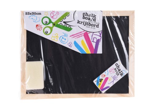 Černá tabule je lemována rámečkem z borového dřeva (FSC 100% dřevo). Součástí sady je příslušenství - barevné křídy a houbička na čištění.