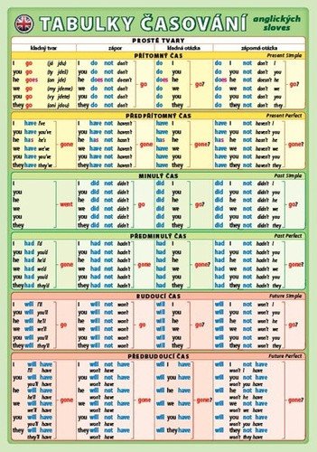Přehledné tabulky všech dvanácti anglických časů - kladný tvar, zápor, kladná otázka, záporná otázka. Vyčasované sloveso go (jít). Barevné značení koncovek a nepravidelností.