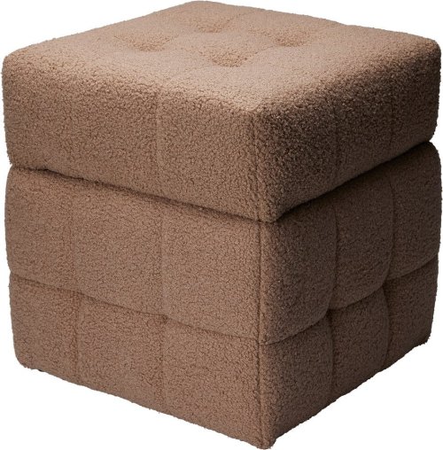 Praktický taburet s úložným prostorem, vyrobený z kombinace MDF, překližky a měkkého materiálu Teddy, vhodný pro uložení hraček nebo drobných předmětů.