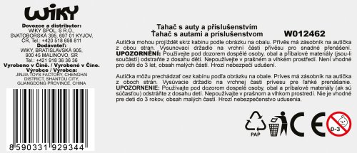 Tahač s auty. Velikost tahače 42 cm. Volná kola. Součástí 5 autíček, 1 vrtulník. Autíčka mohou projíždět skrz kabinu podle obrázku na obalu. Přívěs má zásobník na autíčka z obou stran. Vysunovací držadlo na vrchní části přívěsu pro snadné přenášení.