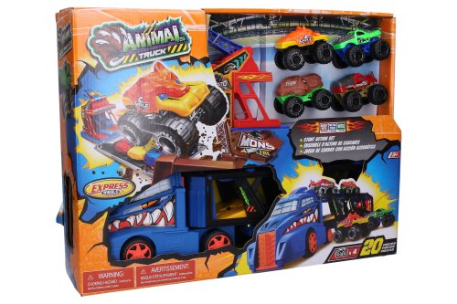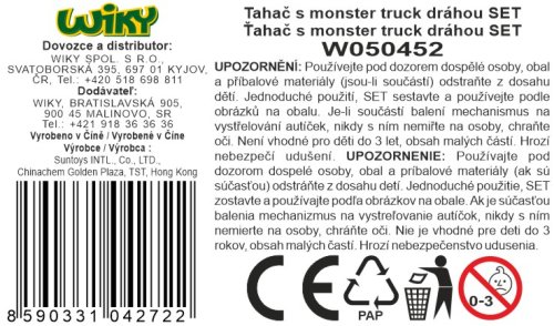 Tahač s monster truck dráhou. Velikost 45cm. 4 monster truck auta součástí. Obrázkový návod na použití na obale. Obsahuje dráhu pro monster truck, která vystřeluje autíčka.