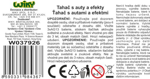 Tahač se 4 auty a efekty. Velikost tahače 45 cm, malých aut 8-10 cm. Na setrvačník. Světelné a zvukové (couvání, troubení, zvuk plošiny, motor) efekty na kabině tahače. 3xAG13 baterie do tahače součástí.
