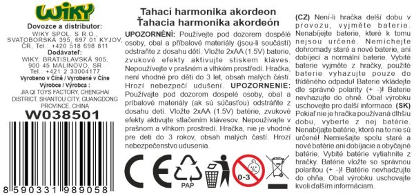 Tahací harmonika akordeon. Rozměry 14x6x23 cm. Zvukové efekty. 2xAA baterie nejsou součástí.