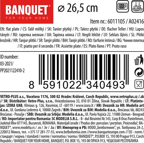 Mělký nedekorovaný talíř. Talíř je vhodný i do gastro provozu, lze jej používat do mikrovlnné trouby a mýt v myčce na nádobí.