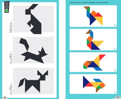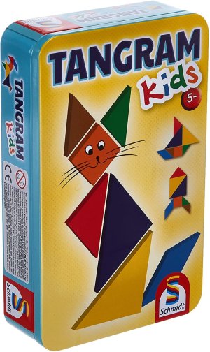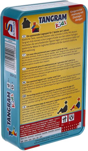 Hlavolamová hra Tangramy SCHMIDT v barevném provedení a předlohami vhodnými pro děti. Vydejte se na dobrodružnou cestu a objevujte, co všechno se dá vytvořit ze sedmi dílků. Hravým způsobem trénujte logické myšlení a prostorové a vizuální vnímání. Předlohy jsou rozděleny do tří úrovní obtížnosti. Menší děti, pro které jsou zadání příliš obtížná, mohou skládat dílky jednoduše rovnou podle řešení. Skládání Tangramů má pouze dvě pravidla: musíte využít všech 7 dílků a dílky se nesmí překrývat. Skládejte podle předloh nebo si vymyslete vlastní tvary. Hlavolam podle staré čínské legendy baví malé i velké po řadu let. Moudrý starý muž nesl skleněnou tabuli zabalenou do hedvábí, plátna a kůže do královského paláce. Cesta byla dlouhá a mudrc musel překonat poušť i řeku, přejít lesy, pole i pohoří. Na skalnatém vrcholu hory muž pohlédl do dáli a spatřil palác, do kterého měl namířeno. Zahleděn do dáli přehlédl malý kamínek, o který zakopl a skutálel se dolů z hory. Ihned rozbalil balík, a k jeho překvapení se sklo nerozříštilo na milion kusů, ale jen na 7 částí - čtverec, kosodélník a 5 trojúhelníků. Nejprve zkusil složit sklo do původního tvaru čtverce. Pak udělal obdélník a po mnoha pokusech i kosodélník. Uvědomil si, že z těchto tvarů je možné vytvořit nespočet kombinací a zajímavých tvarů. Když dorazil do paláce, začal králi vyprávět příběh svého putování a kousky skla využil k vyobrazení toho, co během cesty potkal: domy, lidi, zvířata, lodě i hory. Král byl hrou tvarů ohromen a tak se zrodilo umění tangramu. Baleno v praktické plechové krabičce. Balení obsahuje: 7 dřevěných dílků, 50 předloh včetně řešení. Doporučeno od 5 let.