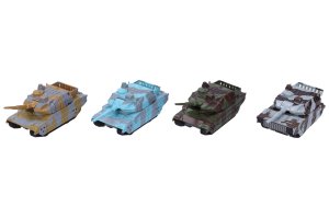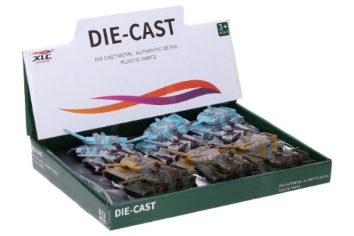 Tank na zpětné natažení (kov). Velikost 8,5 cm. Display box 12 ks. 4 varianty - modrý, šedý, žlutý, zelený.