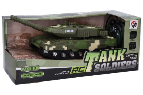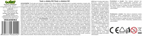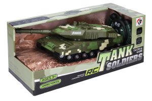 Tank RC na dálkové ovládání s efekty. Rozměry 28x11x8 cm. Ovladač - pohyb dopředu, dozadu, doleva, doprava, efekty, prostřední tlačítko bez funkce. 1x3,7V 500mAh battery pack, součástí balení. Ovladač - 2xAA (1,5V), nejsou součástí. USB nabíjecí kabel součástí balení. Frekvence 27 MHz.