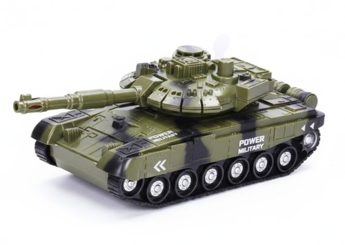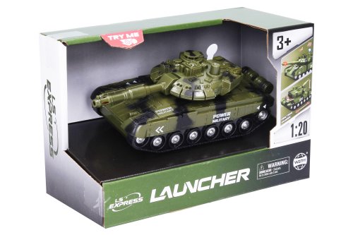 Tank s efekty. Velikost 19,5 x 8 x 7,5 cm. Světelné a zvukové efekty (zvuk střelby a motoru, blikající kanón). Aktivace stiskem tlačítka na střeše. Na setrvačník. 3xAG13 baterie součástí. měřítko 1:20