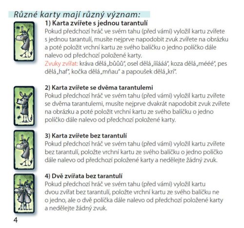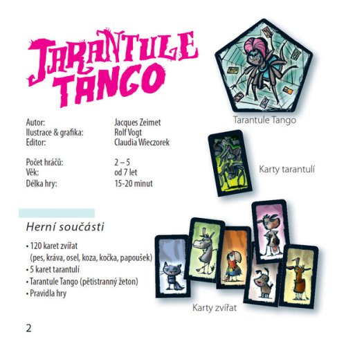 Obsah balení: 115 karet zvířat 5 karet tarantulí Tarantule Tango (pětistranný žeton) česká a slovenská pravidla hry