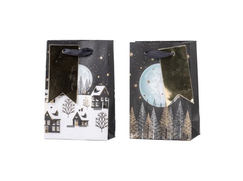 Malá dárková taška o rozměru 100×150 mm s elegantními motivy zimní krajiny v kombinaci černé, bílé a zlaté. Vyrobena z kvalitního papíru, doplněna pevnými uchy pro snadnou manipulaci.