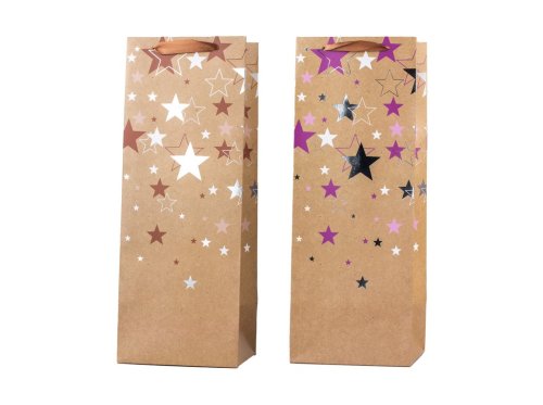Vysoká dárková taška o rozměru 150×400 mm zdobená motivem hvězdiček v mixu přírodní, fialové, bílé a hnědé barvy. Je vyrobena z kvalitního pevného papíru a vhodná pro lahve či úzké dárky. Elegantní provedení se hodí pro celoroční i vánoční dárkování. Zboží je dodáváno v mixu. Doručované zboží je vybíráno náhodně a nelze vybrat konkrétní provedení.