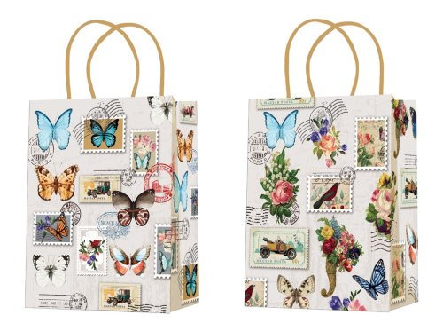 Dárková taška o rozměru 180×230 mm s dekorativními motivy dopisních známek a motýlů v různých designech. Barevné provedení je dodáváno v mixu, jednotlivé tašky se mohou lišit motivem i barevným laděním.