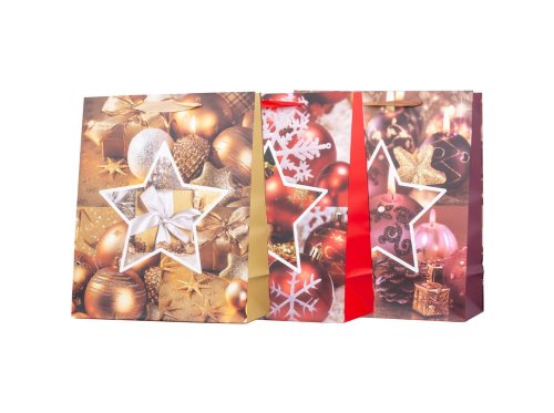 Stylová dárková taška o rozměrech 260×320 mm s motivem vánočních ozdob v kombinaci zlaté, červené a fialové barvy je ideální pro elegantní balení dárků. Pevný materiál a praktická ucha zajišťují pohodlné přenášení, zatímco sváteční design přidá vašemu dárku kouzelný vánoční nádech. Skvělá pro rodinu, přátele i firemní balení.