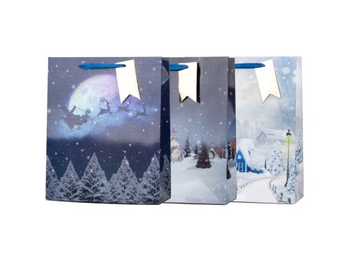 Velká dárková taška o rozměru 260×320 mm s nádhernými motivy zimní krajiny v různém barevném provedení. Taška je vyrobena z kvalitního pevného papíru a doplněna odolnými uchy, díky kterým je vhodná i na těžší či větší dárky, jako jsou knihy, textilie, dekorace nebo dárkové sady.