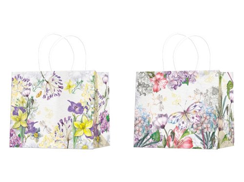 Dárková taška o rozměru 320×260 mm s dekorativními motivy různých květin v pestrých designech. Barevné provedení je dodáváno v mixu, jednotlivé tašky se mohou lišit motivem i barevným laděním.