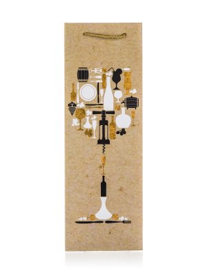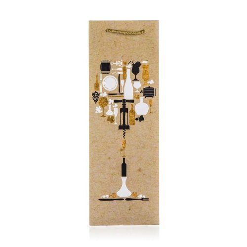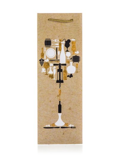 Dárková taška na láhev s dekorem, je vyrobena z papíru a vybavena textilním uchem.