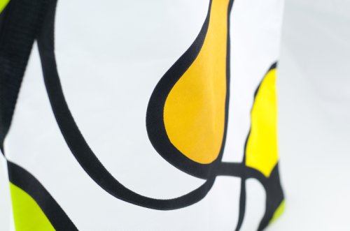Taška je z odolné umělé tkaniny s černými ornamenty a černými uchy. Je opatřena zipem. Tašku lze prát šetrně v ruce. Doporučená nosnost je 2 kg.