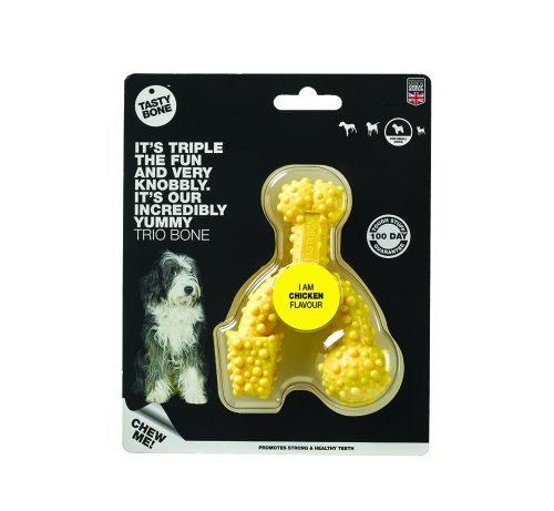 Trojnásobná zábava. Neuvěřitelně lahodná trio kostička. Stejně jako všechny nylonové pamlsky TastyBone i tento byl testován na těch nejenergičtějších mlsounech.