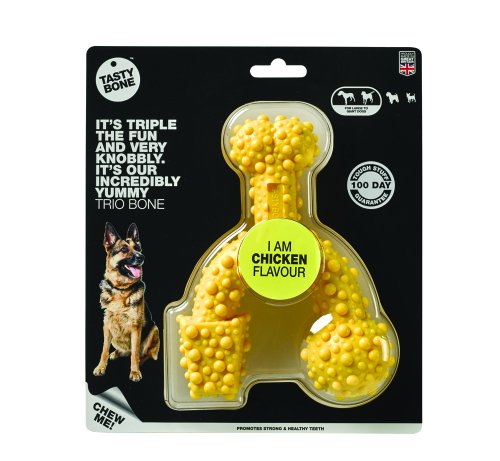 Trojnásobná zábava. Neuvěřitelně lahodná trio kostička. Stejně jako všechny nylonové pamlsky TastyBone i tento byl testován na těch nejenergičtějších mlsounech.